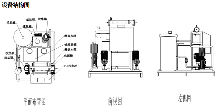 DBM一体式次氯酸钠发生系统是将现场制氯的多个单元集成在一起,并设置一个撬装总成,方便设备的安装、运输及移动。一体式次氯酸钠发生系统主要模块包括软水器、溶盐罐、稀盐水罐、溶盐泵、稀盐水泵、电解槽总成、整流电源、PLC控制柜、储存罐、投加计量泵、排氢风机(选配)、酸洗系统(客户也可自由选择倒极工艺,此项无需配置)等。